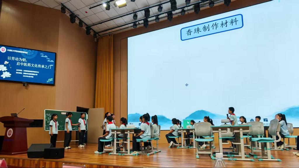 活动现场,耀南小学呈现了丰富多彩的劳动教育实践成果。从《制作驱蚊香珠》的劳动课堂,到学生自主展示的养生操与项目化学习成果,无不体现出劳动教育与中医药文化融合的育人智慧。孩子们在动手实践中感悟“君臣佐使”的中医哲学,体会“炮制虽繁必不敢省人工”的匠心精神,劳动成为传承文化、涵养品格的有效载体。